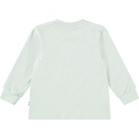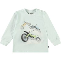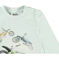 Langærmet bluse i økologisk bomuldsjersey til de mindste. Blusen har god bevægelighed, lange ærmer og ribkant på ærmerne. Den har også knaplukning på skulderen, hvilket gør den nem at tage på. Blusen er lys med motocross-print og et smil.