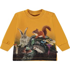 Orange bluse med placement print til de mindste. På printet ses små gnavere og forskellige svampe fra skovbunden. Man kan altid finde et eventyr, hvis man bare kigger efter. Denne bluse er fremstillet i 100% bomuld, har lange ærmer, og trykknapper ved halsen, så blusen er nem at få af og på. Match evt. denne trøje med bukserne, Sabb, i printet "Tree Root".