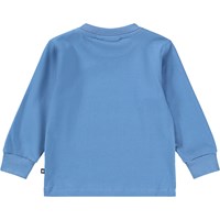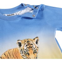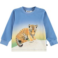 Blå, langærmet bluse med tigerprint i økologisk bomuldsjersey til de mindste. Blusen har ribkanter ved ærmerne, god bevægelighed og knaplukning på skulderen for nem af- og påklædning.