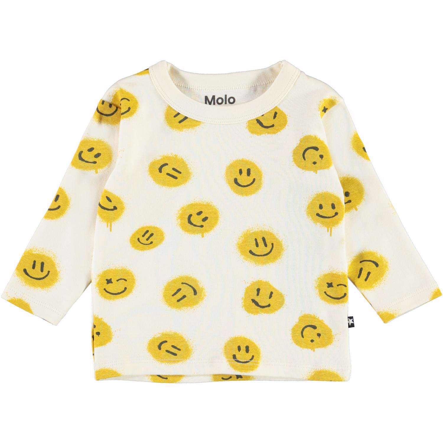 Earth er en cremefarvet langærmet babybluse med glade gule smileyer, samt hvid kant ved halsen. Kombiner blusen med matchende bukser. Certificeret af Ecocert Greenlife, certifikationsnummer 197496.