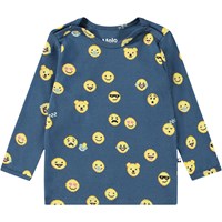 Mørkeblå bluse i økologisk bomuldsjersey til de mindste. Blusen har lange ærmer og trykknapper ved halsen, hvilket gør den nem at få af og på. På fronten er der et placeret print af en glad pixel emoji.