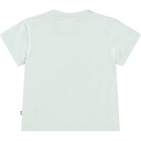 Klassisk t-shirt til de mindste i økologisk bomuld. T-shirten har en løs pasform, rund hals med ribkant samt knaplukning på venstre skulder, der gør den nem at tage på. T-shirten er lyseblå med print af en glad kattekilling.
