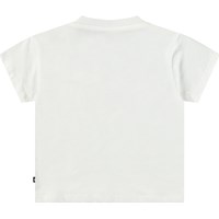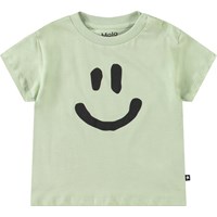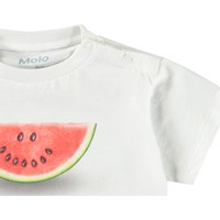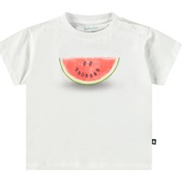 Klassisk t-shirt til de mindste i økologisk bomuld. T-shirten har en løs pasform, rund hals med ribkant samt knaplukning på venstre skulder, der gør den nem at tage på. T-shirten er hvid med print af en smilende vandmelon.