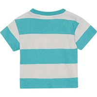 Klassisk t-shirt til de mindste i økologisk bomuld. T-shirten har en løs pasform, rund hals med en ribkant samt to trykknapper på venstre skulder, der gør den nem at komme i. T-shirten har brede striber i sandfarvet og petroleumsblå farver, samt et sødt print på brystet af en søstjerne.