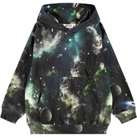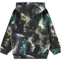Sort hættetrøje med spaceprint i økologisk bomuld. Trøjen har lange ærmer, dobbeltforet hætte, bred ribkant ved ærme og hofte samt en kængurulomme på fronten.