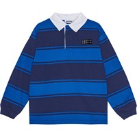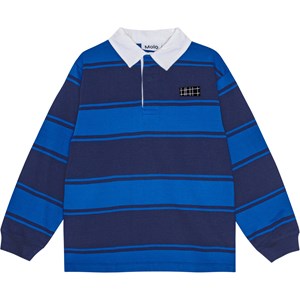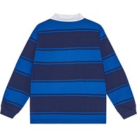 Blå bredstribet polobluse i økologisk bomuld med brede striber. Blusen har en almindelig pasform, lange ærmer med ribkant, en hvid skjortekrave og et logo på fronten. Den har en lille stolpelukning med tre skjulte knapper, hvilket gør den nem at tage på.