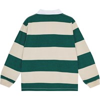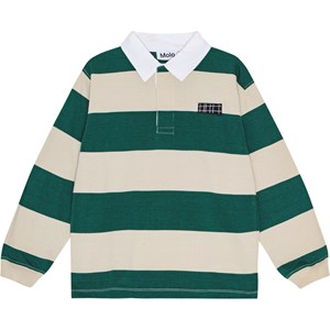 Mørkegrøn og råhvid polobluse i økologisk bomuld med brede striber. Blusen har en almindelig pasform, lange ærmer med ribkant, en hvid skjortekrave og et logo på fronten. Den har en lille stolpelukning med tre skjulte knapper, hvilket gør den nem at tage på.