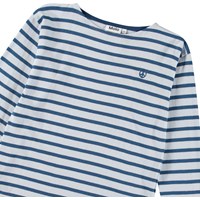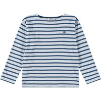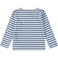 Stribet blå og lyseblå bluse i blødt økologisk bomuld med lange ærmer og indvendigt kantbånd i halsen. T-shirten har en løs pasform med et lille broderet peacetegn på brystet.