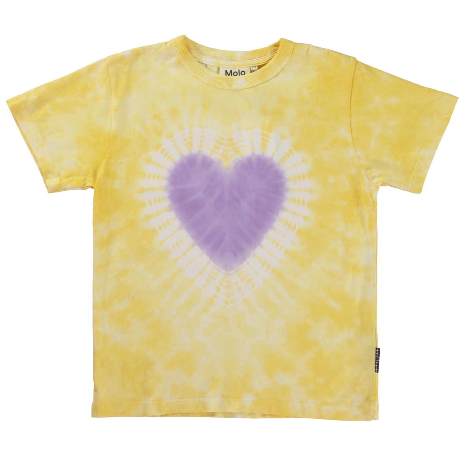 Riley er oversized unisex t-shirt med gult tie-dye print og lilla hjerte. T-shirten har korte ærmer og en rund halsudskæring. Alt Molos tie-dye er håndlavet og hvert produkt har derfor sit eget unikke udtryk.