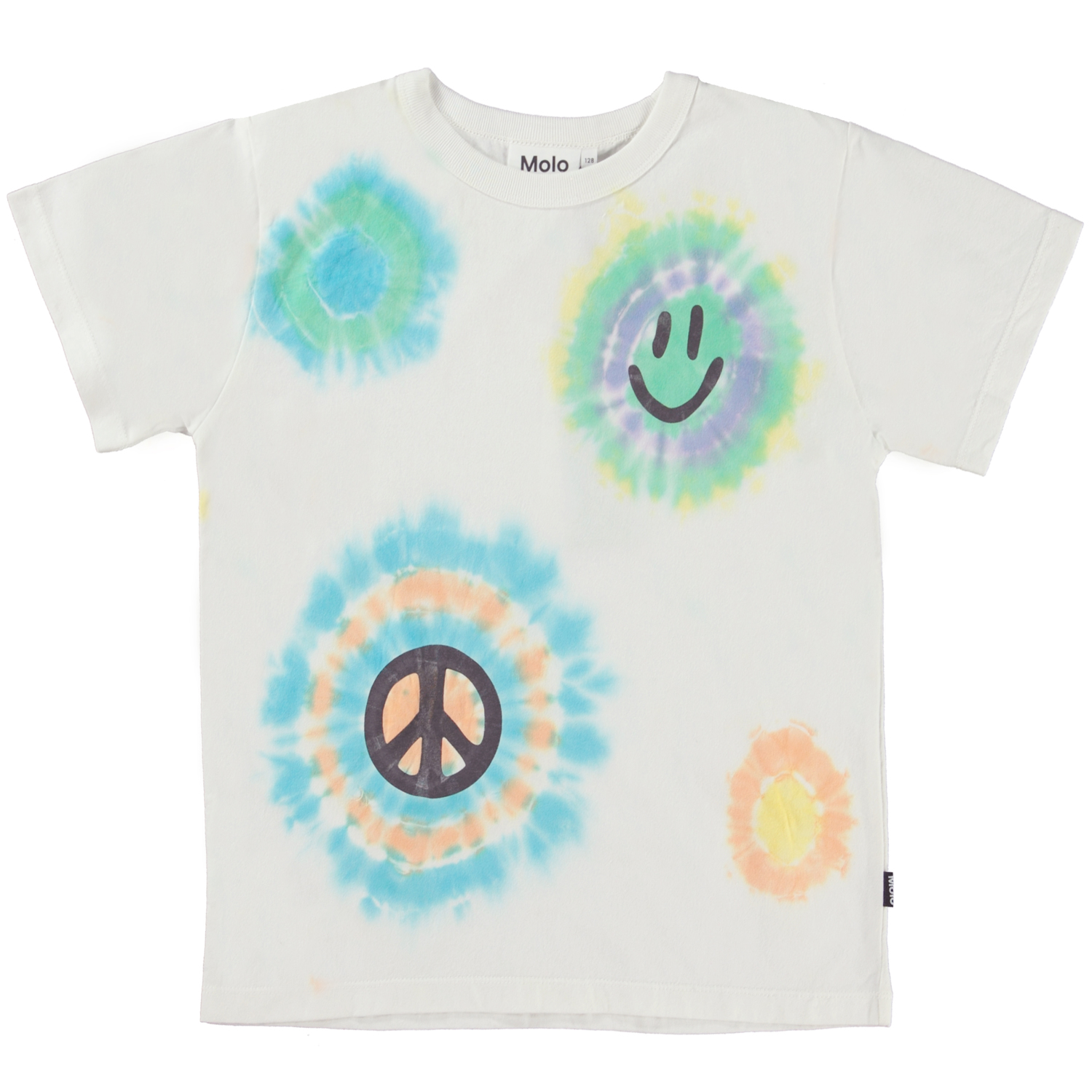 Riley er oversized unisex t-shirt i hvid med tie-dye print, peace tegn og en smiley. T-shirten har korte ærmer og en rund halsudskæring. Alt Molos tie-dye er håndlavet og hvert produkt har derfor sit eget unikke udtryk.