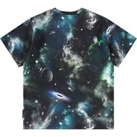Sort t-shirt i blødt økologisk bomuld med korte ærmer og ribkant i halsen. T-shirten har en løs pasform og et print af nattehimlen, nordlys, planeter og satellitter i flotte farver.