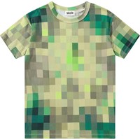 Grøn økologisk bomulds T-shirt med korte ærmer, rund halsudskæring og ribkant. Løs pasform med alloverprint af store pixels i grønne nuancer.