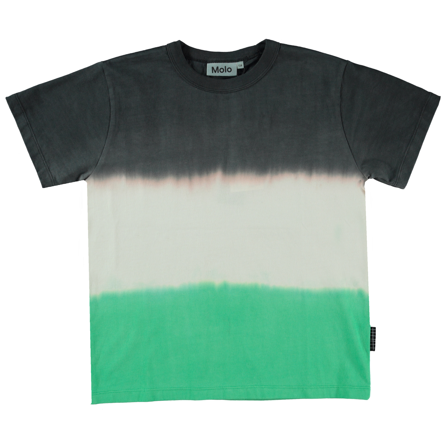 Riley er oversized unisex t-shirt med stribet tie-dye print i grøn, hvid og grå. T-shirten har korte ærmer og en rund halsudskæring. Alt Molos tie-dye er håndlavet og hvert produkt har derfor sit eget unikke udtryk.
