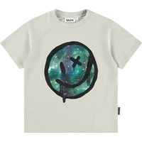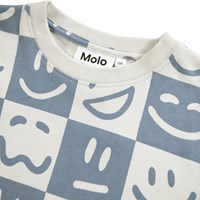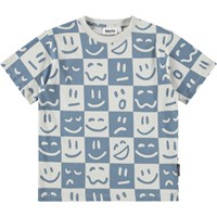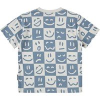Ternet blå og råhvid t-shirt til børn i blødt økologisk bomuld med korte ærmer og ribkant i halsen. T-shirten har en løs pasform med et print af ansigter i forskelligt humør.