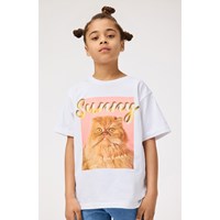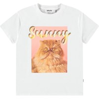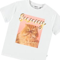 Hvid t-shirt i blødt økologisk bomuld med korte ærmer og ribkant i halsen. T-shirten har en løs pasform samt et frontprint af en orange kat og teksten 'Sonny The Chasmer'.