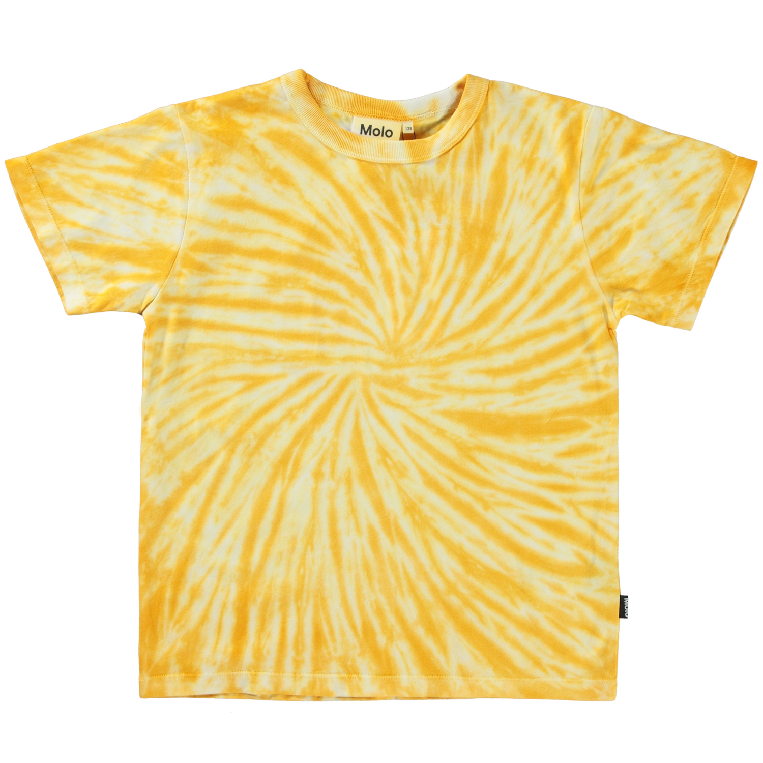 Riley er oversized unisex t-shirt med gult tie-dye print. T-shirten har korte ærmer og en rund halsudskæring. Alt Molos tie-dye er håndlavet og hvert produkt har derfor sit eget unikke udtryk.