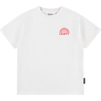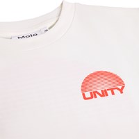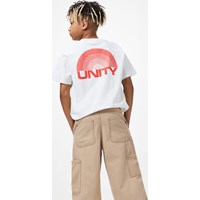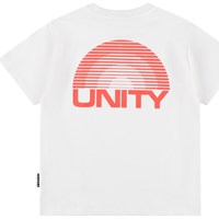 Hvid t-shirt i blødt økologisk bomuld med korte ærmer og ribkant i halsen. T-shirten har en løs pasform med print af teksten Unity.