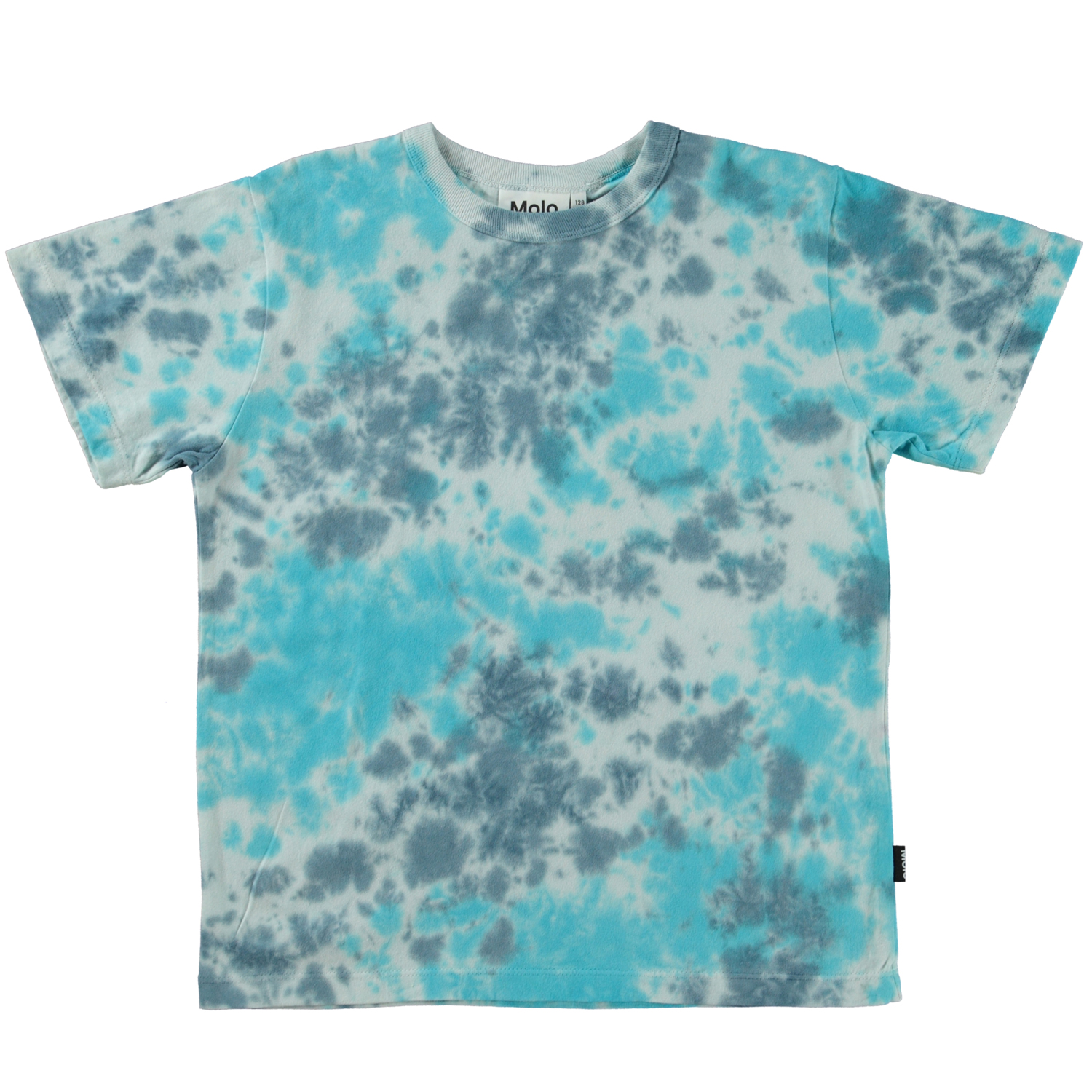 Riley er oversized unisex t-shirt med tie-dye print i blå og turkis. T-shirten har korte ærmer og en rund halsudskæring. Alt Molos tie-dye er håndlavet og hvert produkt har derfor sit eget unikke udtryk.