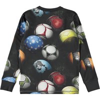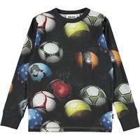 Rill er en unisex langærmet bluse i sort med print af farverige fodbolde. Blusen har grå ribkant ved hals og ærmeafslutning.