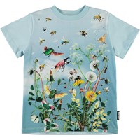 Road er en lyseblå unisex t-shirt med print vilde blomster og insekter. T-shirten har rund halsudskæring.