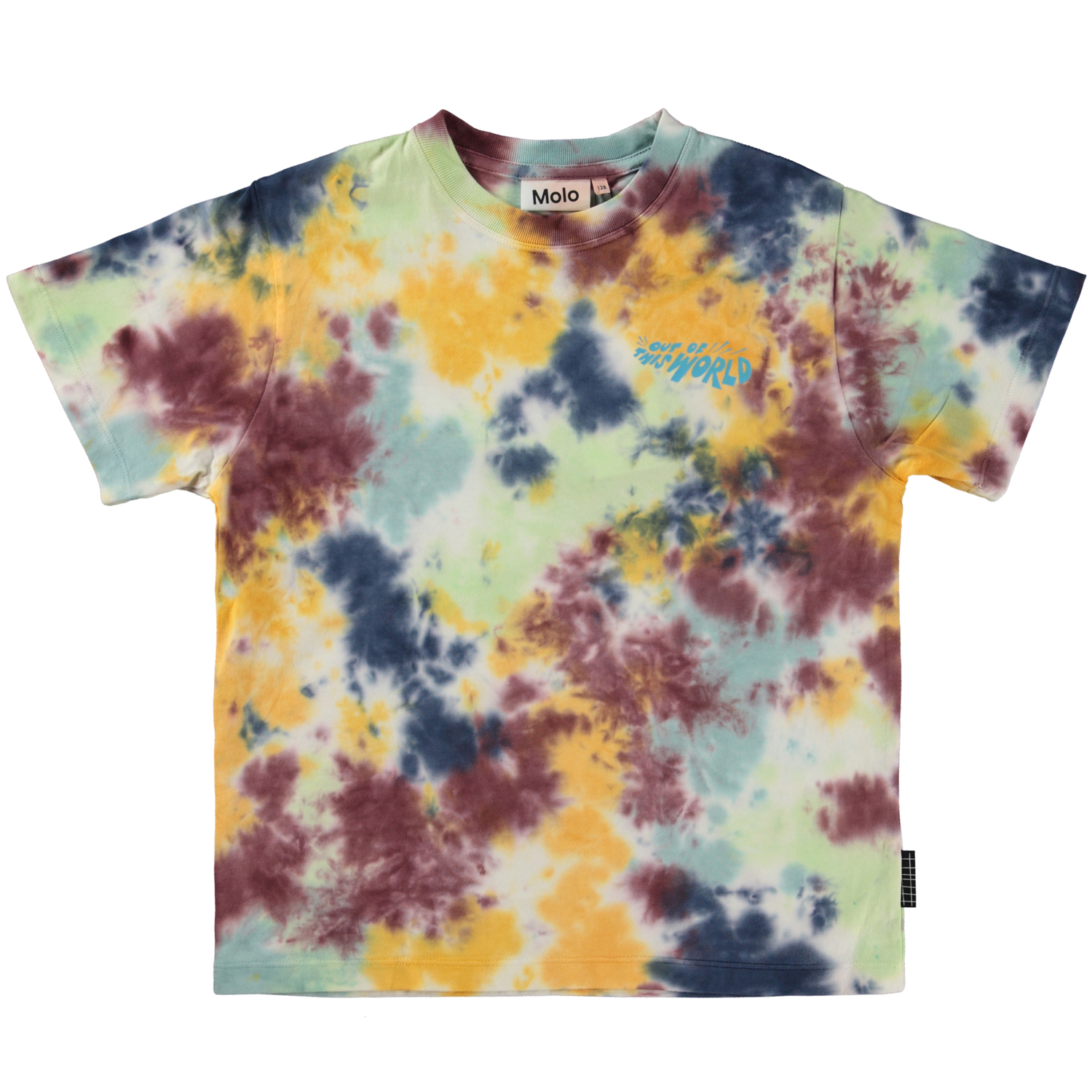 Multifarvet t-shirt i allover print. Allover printet er et tie-dye print i blå, bordeaux og gule nuancer, og oven på det er der et front print i blåt, med teksten "Out of this World". T-shirten har også et stort rygprint, med 2 rumvæsner, der tror på at mennesker findes derude. Denne t-shirt er fremstillet i 100% økologisk bomuld, har korte ærmer, rund halsudskæring med ribkant, samt et oversize fit.