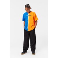 Blå og orange tie-dye t-shirt i økologisk bomuld. T-shirten har korte ærmer, en rund halsudskæring og ribkant i halsen. Den har en oversized pasform og et placeret print på fronten med teksten "I'm Real". Alt vores tie-dye er håndlavet, hvilket skaber et unikt mønster, der varierer fra style til style.