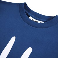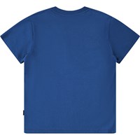 Blå t-shirt i blødt økologisk bomuld med korte ærmer og ribkant i halsen. T-shirten har en løs pasform med et hvidt print på fronten af et smilende ansigt.