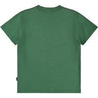 Grøn t-shirt i blødt økologisk bomuld med korte ærmer og ribkant i halsen. T-shirten har en løs pasform med et hvidt print på fronten af et smilende ansigt.