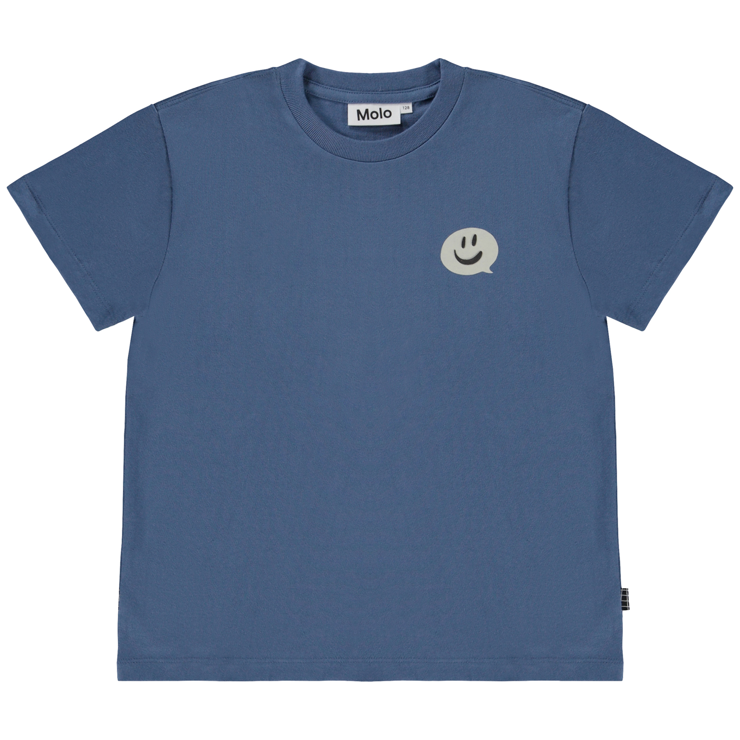 Blå t-shirt med front print. Printet er en lille grå taleboble, som sidder i siden og siger glade og søde ting til dig.Denne t-shirt er fremstillet i 100% økologisk bomuld, har korte ærmer, rund halsudskæring med ribkant, samt et regulært fit.