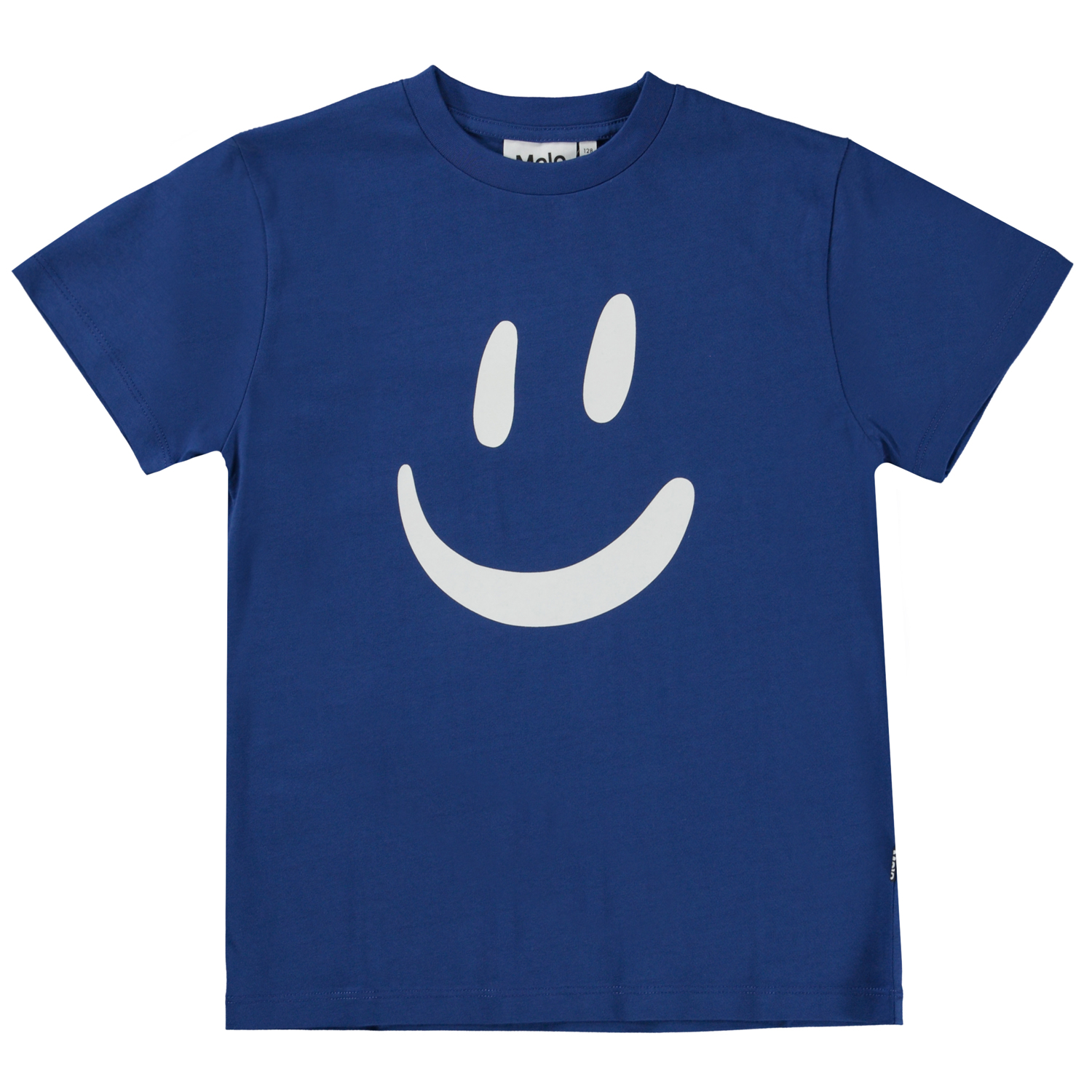 Blå t-shirt med front print. Printet er et stort smil i hvid. Denne t-shirt er fremstillet i 100% økologisk bomuld, har korte ærmer, rund halsudskæring med ribkant, samt et regulært fit.