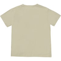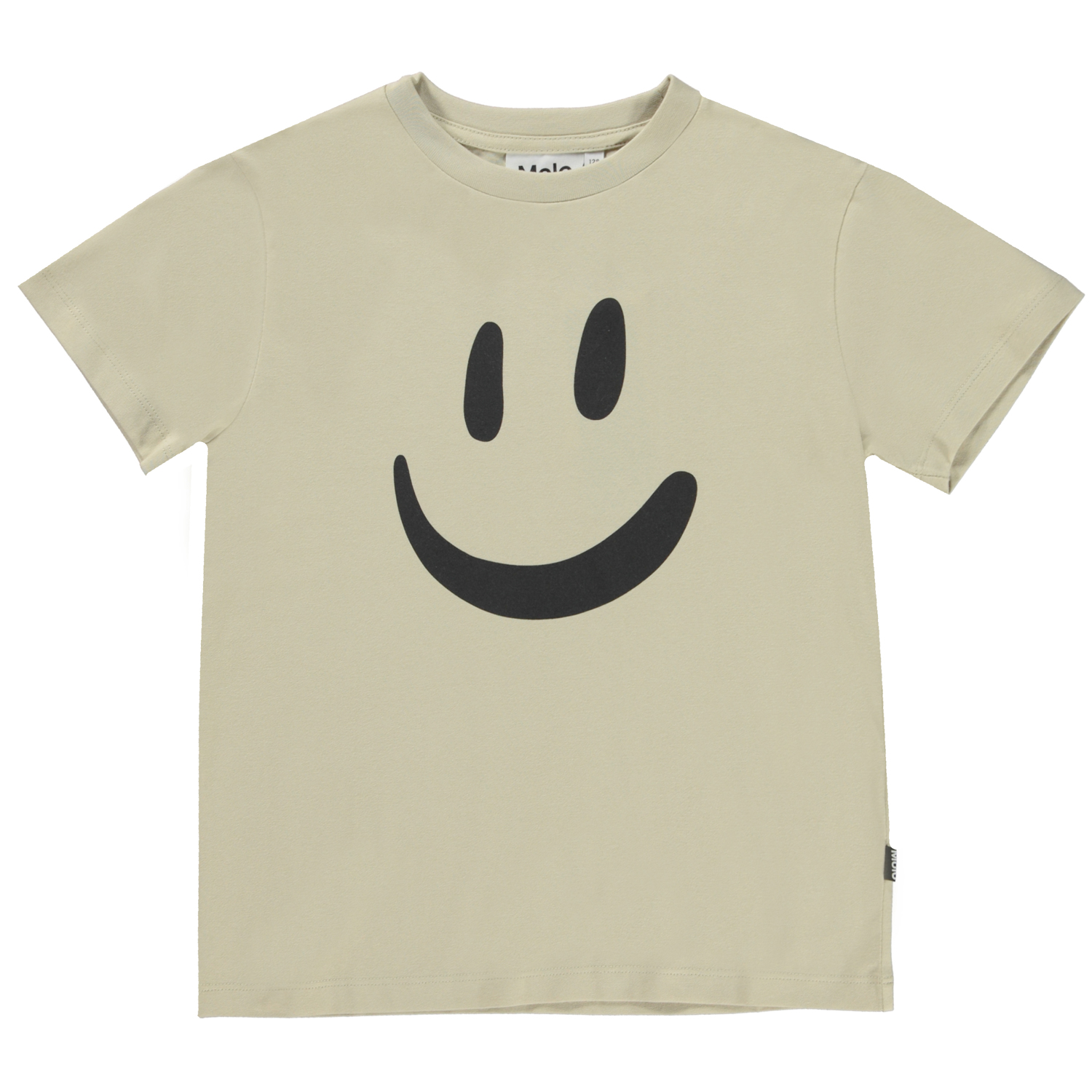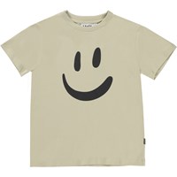 Beige t-shirt med front print. Printet er et stort smil i sort. Denne t-shirt er fremstillet i 100% økologisk bomuld, har korte ærmer, rund halsudskæring med ribkant, samt et regulært fit.