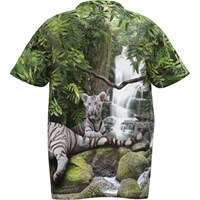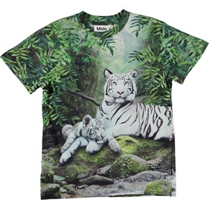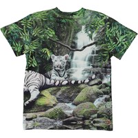 Kortærmet t-shirt i økologisk bomuld med gennemgående print på både front og bagside. Printet forestiller en tigermor og hendes to unger, der slænger sig på de kølige sten nær et rislende vandløb i en frodig grøn jungle. Nederst på t-shirten er påtrykt sort Panthera logo.