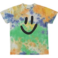 Roxo er en farverig unisex t-shirt tie-dye print og en smiley på fronten. T-shirten har korte ærmer og en rund halsudskæring. Alt Molos tie-dye er håndlavet og hvert produkt har derfor sit eget unikke udtryk.