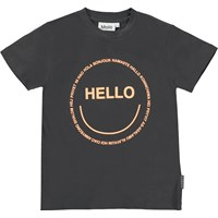 Roxo er en sort t-shirt med print af en smiley og teksten 'hello'. T-shirten har korte ærmer og en rund halsudskæring.