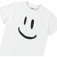 Hvid t-shirt i økologisk bomuld med korte ærmer og ribkant i halsen. T-shirten har en løs pasform og et stort sort smilende ansigt på fronten.