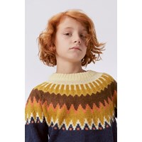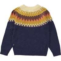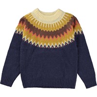 Mørkeblå striktrøje med grafisk detalje. Denne trøje er fremstillet i en lækker alpaca uld blanding, der gør den perfekt til de kolde dage. Trøjen har en rund halsudskæring med en strikket ribkant, raglanærmer , samt strikket rib ved ærmer og hofte. Denne striktrøje har en fint nordisk inspireret mønster ved kraven i gule og brune nuancer, samt et regulært fit.