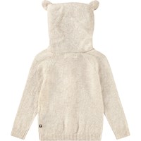 Råhvid striktrøje i uld/cashmere med hætte og knapper ned langs fronten. Perfekt til de mindste. Trøjen har en sød hætte med bamseører og ribkant ved ærmer og hofte.