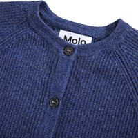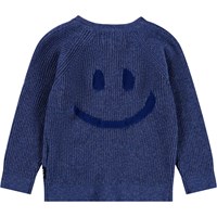 Mørkeblå strik cardigan til de mindste i en blød bomuld og uld blanding med et smilende ansigt på ryggen. Cardiganen har en rund halsudskæring med ribkant, ribkant ved hofte og ærmer samt knaplukning på fronten.