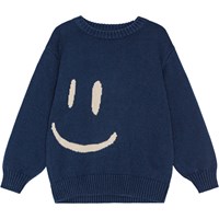 Armygrøn striktrøje i bomuld/uld med rund halsudskæring, ribkanter ved håndled og hofte. Trøjen har en løs pasform og et frontmønster. På fronten af trøjen er der et stort smilende pixelansigt i gul med sort outline.