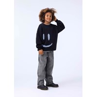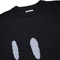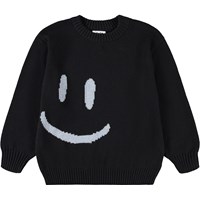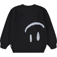 Sort striktrøje i uld- og bomuldsblanding med rund halsudskæring, ribkant ved håndled og hofte. Løs pasform og stort mønster af et stort smilende ansigt på front og ryg.