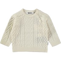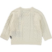 Råhvid striktrøje i kabelstrik, til de mindste. Denne trøje er fremstillet i en bomuld/uld blanding, har rib ved hænder og hofte, en rund halsudskæring med ribkant og knapper ved halsen, så trøjen er let at får både af og på. Match evt. denne trøje med bukserne, Sedge, i samme kvalitet for det perfekte sæt.