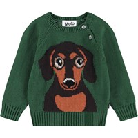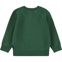 Mørkegrøn striktrøje til de mindste i en blød bomuld og uld blanding med en hund på fronten. Trøjen har en rund halsudskæring, ribkanter og knapper ved halsen, hvilket gør det nemt at få den både af og på. Kombiner med matchende bukser for et komplet sæt.