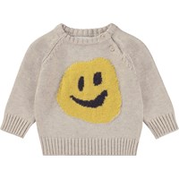 Beige striktrøje til de mindste med et smilende ansigt på maven. Denne trøje er fremstillet i en bomuld/uld blanding, har rib ved hænder og hofte, en rund halsudskæring med ribkant og knapper ved halsen, så trøjen er let at får både af og på. Match evt. denne strøje med bukserne, Sol, i samme kvalitet for det perfekte sæt.