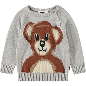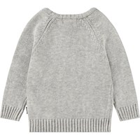 Grå striktrøje til de mindste med en bamse på maven. Trøjen har en rund halsudskæring, ribkanter og knapper ved halsen, hvilket gør det nemt at få den både af og på.