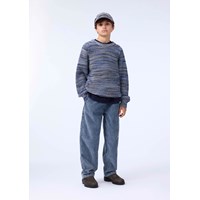 Multifarvet striktrøje i blå nuancer lavet i uldblanding. Strikken har raglanærmer og rund halsudskæring. Trøjen har ribstrik ved halsudskæringen, ærmerne og hofteområdet. Den har en almindelig pasform.