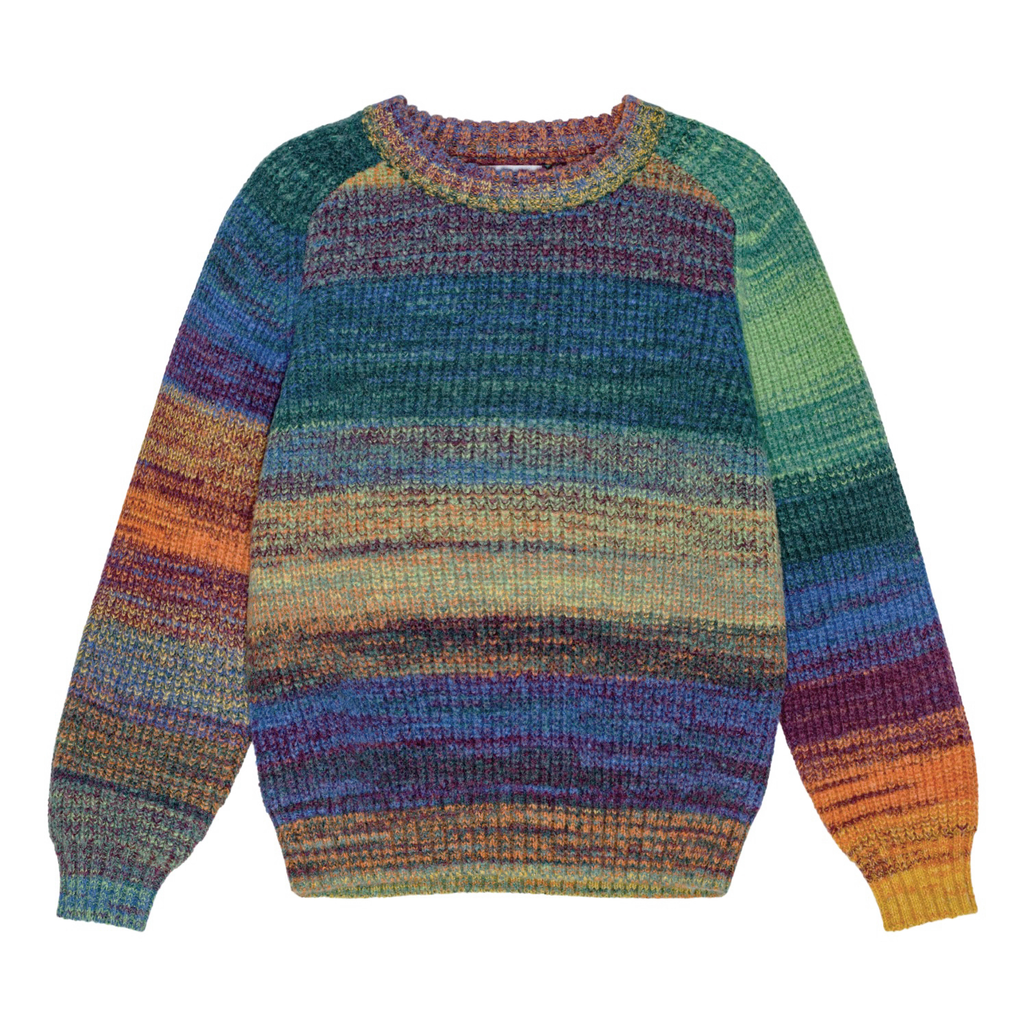 Multifarvet striktrøje med raglanærmer og rund halsudskæring. Trøjen har ribstrik ved halsudskæringen, ærmerne og hofteområdet. Den har en almindelig pasform.