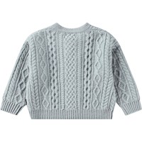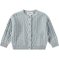 Lyseblå strikcardigan i uld til de mindste. Cardiganen har fine detaljer i kabelstrik og en rund halsudskæring med ribkant. Der er også ribkanter ved hofte og ærmer samt en knaplukning langs fronten.