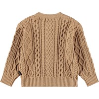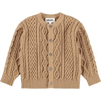 Brun strikcardigan i en blød blanding af bomuld og uld, designet til de mindste. Cardiganen har knaplukning på fronten, kabelstrikdetaljer, en rund halsudskæring med ribkant samt ribkanter ved hofterne og ærmerne.