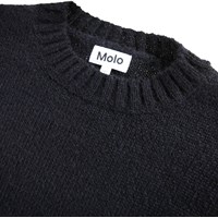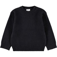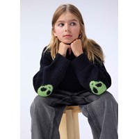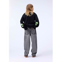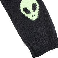 Sort striktrøje i alpaka-uldblanding. Trøjen har en sjov detalje med vævede grønne alien på albuerne. Trøjen har ribstrik ved halsudskæringen, ærmerne og hofteområdet. Den har en almindelig pasform.