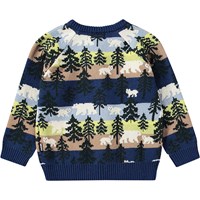 Multifarvet strikcardigan i bomuld/uld til de mindste. Cardiganen har en rund halsudskæring med ribkant samt ribkanter ved hofte og ærmer. Den har en knaplukning langs fronten og et allover mønster med isbjørne og grantræer.